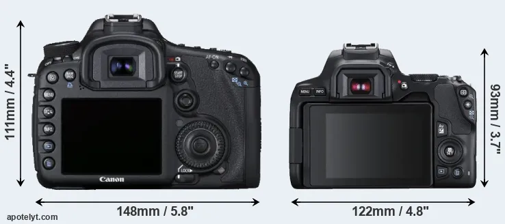 The physical size and weight of the Canon 7D and the Canon SL3 are illustrated in the side-by-side display below. The two cameras are presented according to their relative size. Three successive views from the front, the top, and the rear are shown. All width, height and depth dimensions are rounded to the nearest millimeter.