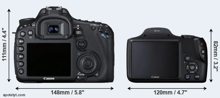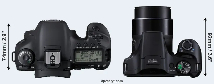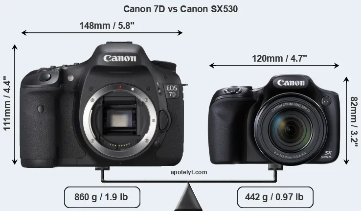 The side-by-side display below illustrates the physical size and weight of the Canon 7D and the Canon SX530. The two cameras are presented according to their relative size. Three successive views from the front, the top, and the rear are shown. All width, height and depth dimensions are rounded to the nearest millimeter.