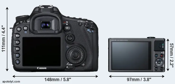 The side-by-side display below illustrates the physical size and weight of the Canon 7D and the Canon SX620. The two cameras are presented according to their relative size. Three consecutive perspectives from the front, the top, and the back are available. All width, height and depth measures are rounded to the nearest millimeter.