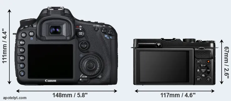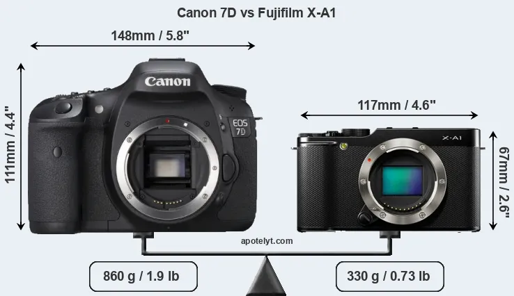 The side-by-side display below illustrates the physical size and weight of the Canon 7D and the Fujifilm X-A1. The two cameras are presented according to their relative size. Three consecutive perspectives from the front, the top, and the back are available. All width, height and depth measures are rounded to the nearest millimeter.