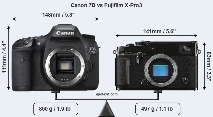 An illustration of the physical size and weight of the Canon 7D and the Fujifilm X-Pro3 is provided in the side-by-side display below. The two cameras are presented according to their relative size. Three consecutive perspectives from the front, the top, and the back are available. All size dimensions are rounded to the nearest millimeter.