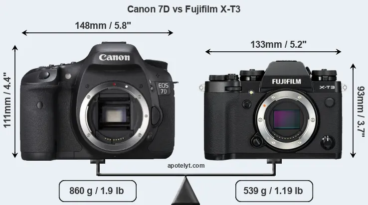 The above size and weight comparisons are to some extent incomplete since they do not consider the interchangeable lenses that both of these cameras require. Both cameras have similarly sized sensors, but DSLRs have a larger flange-to-focal plane distance than mirrorless cameras, which imposes contraints on the optical engineering process and generally leads to bigger and heavier lenses. You can compare the optics available for the two cameras in the Canon EF Lens Catalog (7D) and the Fujinon X Lens Catalog (X-T3). Mirrorless cameras, such as the X-T3, have moreover the advantage that they can use many lenses from other systems via adapters, as they have a relatively short flange to focal plane distance.