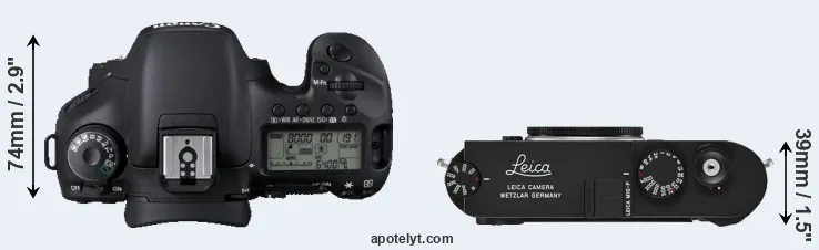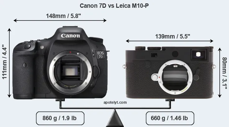 An illustration of the physical size and weight of the Canon 7D and the Leica M10-P is provided in the side-by-side display below. The two cameras are presented according to their relative size. Three consecutive perspectives from the front, the top, and the back are available. All width, height and depth measures are rounded to the nearest millimeter.