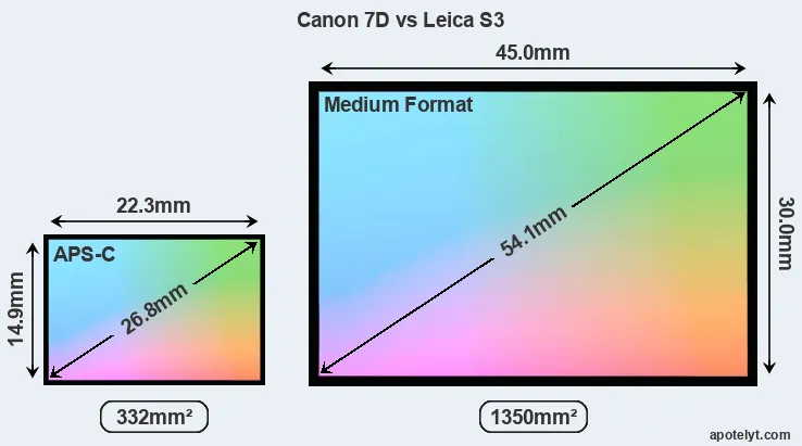 Of the two cameras under consideration, the Canon 7D features an APS-C sensor and the Leica S3 a medium format sensor. The sensor area in the S3 is 307 percent bigger. As a result of these sensor size differences, the cameras have a format factor of, respectively, 1.6 and 0.8. Both cameras have a native aspect ratio (sensor width to sensor height) of 3:2.