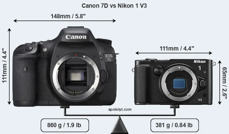 The side-by-side display below illustrates the physical size and weight of the Canon 7D and the Nikon 1 V3. The two cameras are presented according to their relative size. Three consecutive perspectives from the front, the top, and the back are available. All width, height and depth measures are rounded to the nearest millimeter.