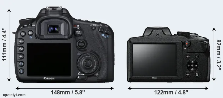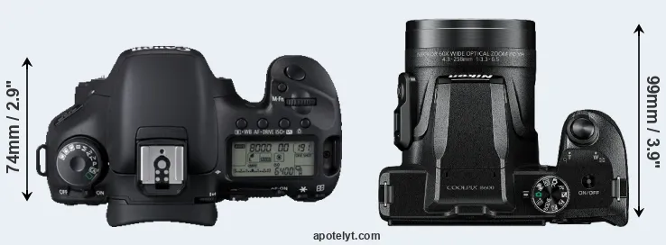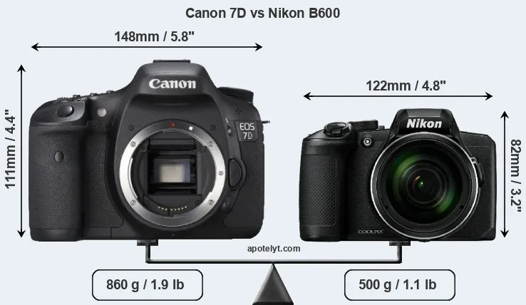 The side-by-side display below illustrates the physical size and weight of the Canon 7D and the Nikon B600. The two cameras are presented according to their relative size. Three successive views from the front, the top, and the rear are shown. All width, height and depth dimensions are rounded to the nearest millimeter.