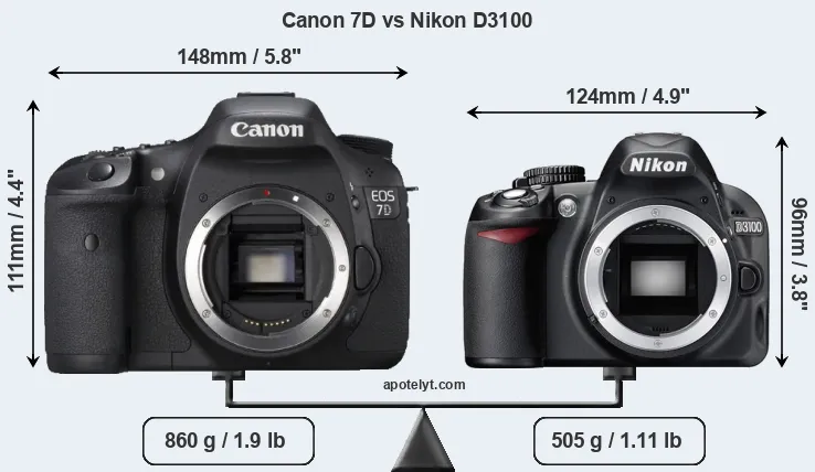 If the front view area (width x height) of the cameras is taken as an aggregate measure of their size, the Nikon D3100 is notably smaller (28 percent) than the Canon 7D. Moreover, the D3100 is substantially lighter (41 percent) than the 7D. It is worth mentioning in this context that the 7D is splash and dust resistant, while the D3100 does not feature any corresponding weather-sealing.