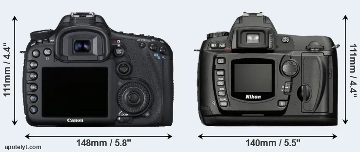The side-by-side display below illustrates the physical size and weight of the Canon 7D and the Nikon D70. The two cameras are presented according to their relative size. Three consecutive perspectives from the front, the top, and the back are available. All width, height and depth dimensions are rounded to the nearest millimeter.