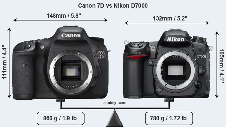 An illustration of the physical size and weight of the Canon 7D and the Nikon D7000 is provided in the side-by-side display below. The two cameras are presented according to their relative size. Three consecutive perspectives from the front, the top, and the back are available. All size dimensions are rounded to the nearest millimeter.