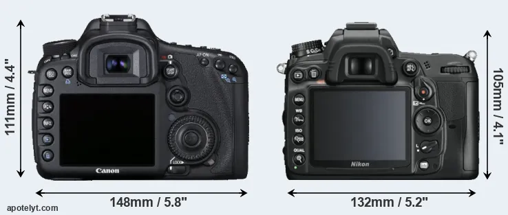 If the front view area (width x height) of the cameras is taken as an aggregate measure of their size, the Nikon D7000 is notably smaller (16 percent) than the Canon 7D. Moreover, the D7000 is markedly lighter (9 percent) than the 7D. In this context, it is worth noting that both cameras are splash and dust-proof and can, hence, be used in inclement weather conditions or harsh environments.