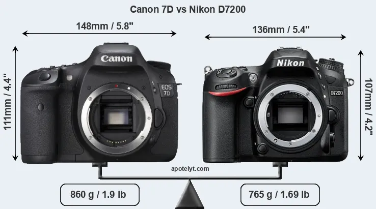 An illustration of the physical size and weight of the Canon 7D and the Nikon D7200 is provided in the side-by-side display below. The two cameras are presented according to their relative size. Three successive views from the front, the top, and the rear are shown. All width, height and depth measures are rounded to the nearest millimeter.