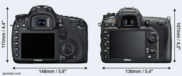 If the front view area (width x height) of the cameras is taken as an aggregate measure of their size, the Nikon D7200 is notably smaller (11 percent) than the Canon 7D. Moreover, the D7200 is markedly lighter (11 percent) than the 7D. In this context, it is worth noting that both cameras are splash and dust-proof and can, hence, be used in inclement weather conditions or harsh environments.