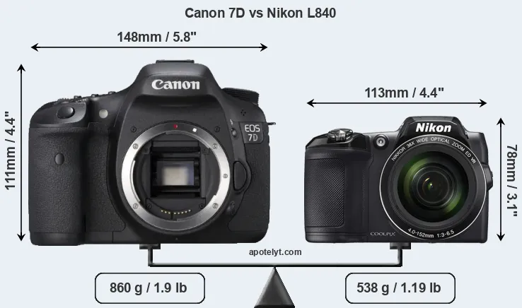 An illustration of the physical size and weight of the Canon 7D and the Nikon L840 is provided in the side-by-side display below. The two cameras are presented according to their relative size. Three consecutive perspectives from the front, the top, and the back are available. All width, height and depth dimensions are rounded to the nearest millimeter.