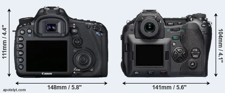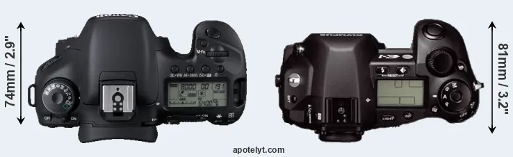 The side-by-side display below illustrates the physical size and weight of the Canon 7D and the Olympus E-1. The two cameras are presented according to their relative size. Three consecutive views from the front, the top, and the rear side are shown. All width, height and depth dimensions are rounded to the nearest millimeter.