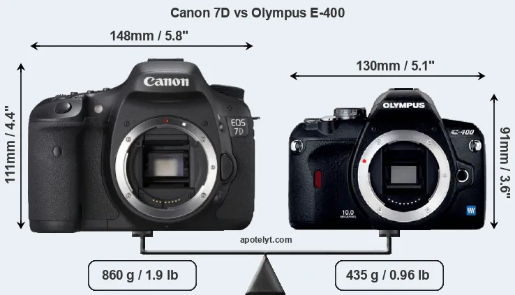 If the front view area (width x height) of the cameras is taken as an aggregate measure of their size, the Olympus E-400 is notably smaller (28 percent) than the Canon 7D. Moreover, the E-400 is substantially lighter (49 percent) than the 7D. It is worth mentioning in this context that the 7D is splash and dust resistant, while the E-400 does not feature any corresponding weather-sealing.