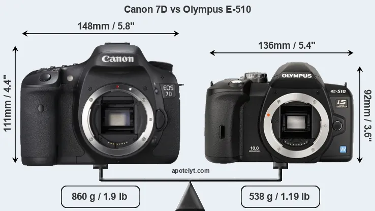 The side-by-side display below illustrates the physical size and weight of the Canon 7D and the Olympus E-510. The two cameras are presented according to their relative size. Three consecutive perspectives from the front, the top, and the back are available. All width, height and depth measures are rounded to the nearest millimeter.