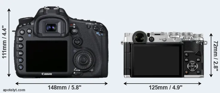 The side-by-side display below illustrates the physical size and weight of the Canon 7D and the Olympus PEN-F. The two cameras are presented according to their relative size. Three consecutive views from the front, the top, and the rear side are shown. All width, height and depth measures are rounded to the nearest millimeter.