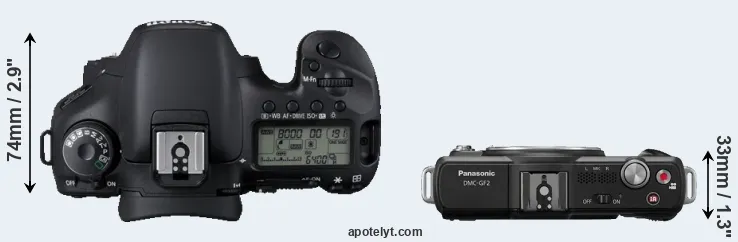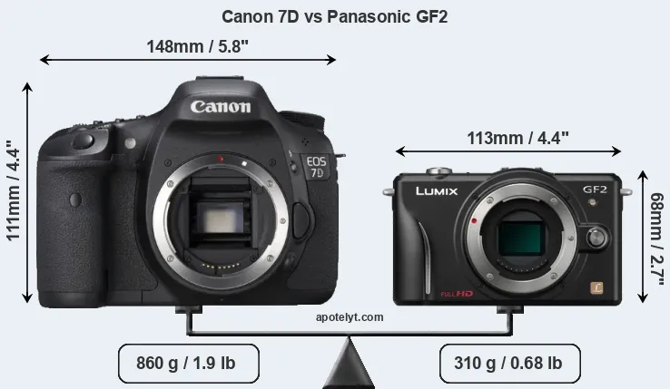 An illustration of the physical size and weight of the Canon 7D and the Panasonic GF2 is provided in the side-by-side display below. The two cameras are presented according to their relative size. Three successive views from the front, the top, and the rear are shown. All size dimensions are rounded to the nearest millimeter.