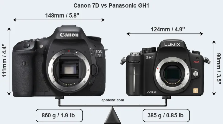 An illustration of the physical size and weight of the Canon 7D and the Panasonic GH1 is provided in the side-by-side display below. The two cameras are presented according to their relative size. Three consecutive perspectives from the front, the top, and the back are available. All width, height and depth dimensions are rounded to the nearest millimeter.