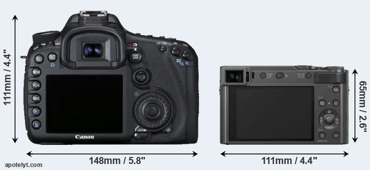 If the front view area (width x height) of the cameras is taken as an aggregate measure of their size, the Panasonic TZ200 is considerably smaller (56 percent) than the Canon 7D. It is worth mentioning in this context that the 7D is splash and dust resistant, while the TZ200 does not feature any corresponding weather-sealing.