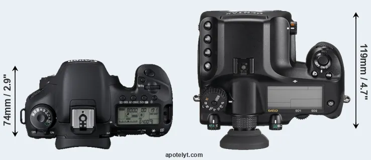 An illustration of the physical size and weight of the Canon 7D and the Pentax 645D is provided in the side-by-side display below. The two cameras are presented according to their relative size. Three successive views from the front, the top, and the rear are shown. All width, height and depth dimensions are rounded to the nearest millimeter.