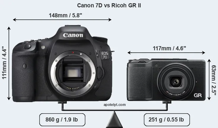 The physical size and weight of the Canon 7D and the Ricoh GR II are illustrated in the side-by-side display below. The two cameras are presented according to their relative size. Three consecutive perspectives from the front, the top, and the back are available. All width, height and depth dimensions are rounded to the nearest millimeter.