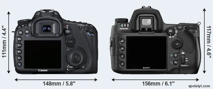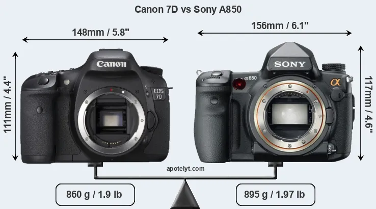 The physical size and weight of the Canon 7D and the Sony A850 are illustrated in the side-by-side display below. The two cameras are presented according to their relative size. Three successive views from the front, the top, and the rear are shown. All width, height and depth measures are rounded to the nearest millimeter.