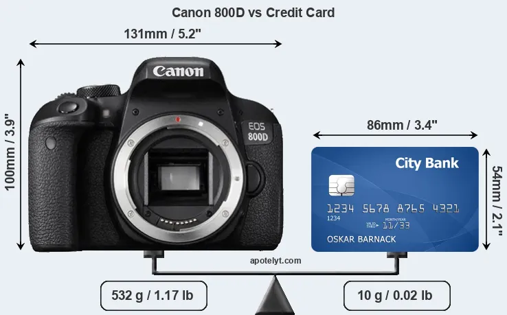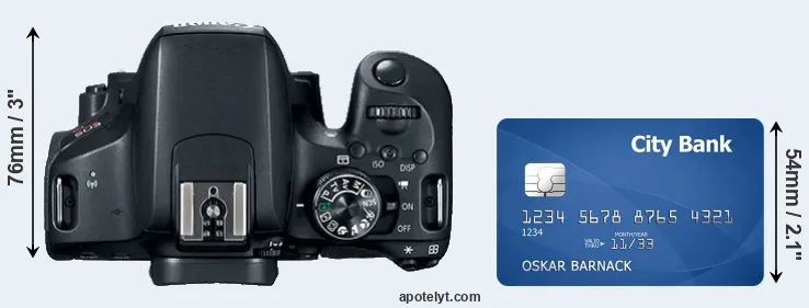 The side-by-side display below illustrates the physical size of the Canon 800D vis-à-vis a credit card. Three consecutive views from the front, the top, and the rear side are shown. All width, height and depth dimensions are rounded to the nearest millimeter.