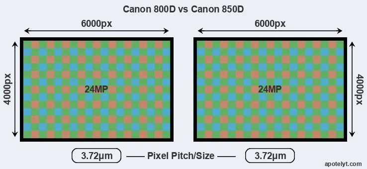 The two cameras under review do not only share the same sensor size, but also offer an identical resolution of 24 megapixels. This similarity in sensor specs implies that both the 800D and the 850D have the same pixel density, as well as the same pixel size. It should, however, be noted that the 850D is much more recent (by 2 years and 11 months) than the 800D, and its sensor will have benefitted from technological advances during this time.