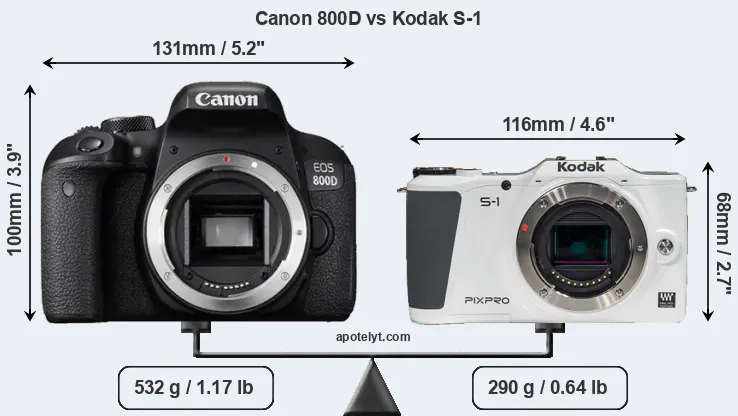 An illustration of the physical size and weight of the Canon 800D and the Kodak S-1 is provided in the side-by-side display below. The two cameras are presented according to their relative size. Three successive views from the front, the top, and the rear are shown. All width, height and depth dimensions are rounded to the nearest millimeter.