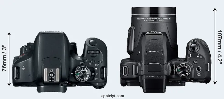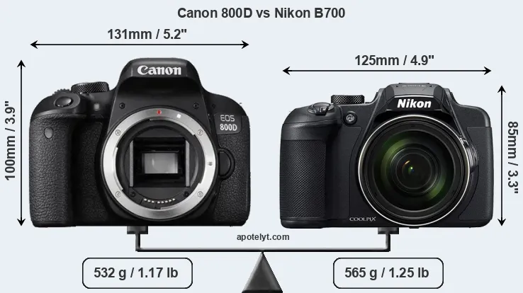 The side-by-side display below illustrates the physical size and weight of the Canon 800D and the Nikon B700. The two cameras are presented according to their relative size. Three successive views from the front, the top, and the rear are shown. All width, height and depth dimensions are rounded to the nearest millimeter.