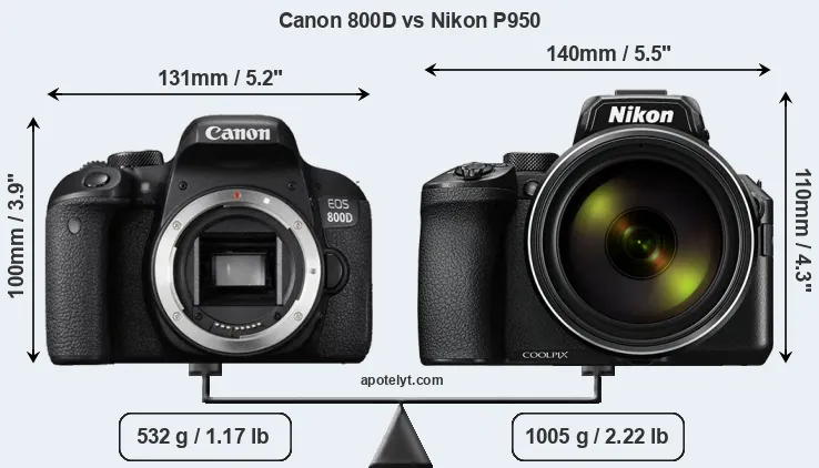 The side-by-side display below illustrates the physical size and weight of the Canon 800D and the Nikon P950. The two cameras are presented according to their relative size. Three consecutive views from the front, the top, and the rear side are shown. All width, height and depth dimensions are rounded to the nearest millimeter.