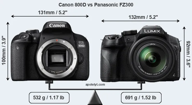 The side-by-side display below illustrates the physical size and weight of the Canon 800D and the Panasonic FZ300. The two cameras are presented according to their relative size. Three consecutive views from the front, the top, and the rear side are shown. All width, height and depth dimensions are rounded to the nearest millimeter.