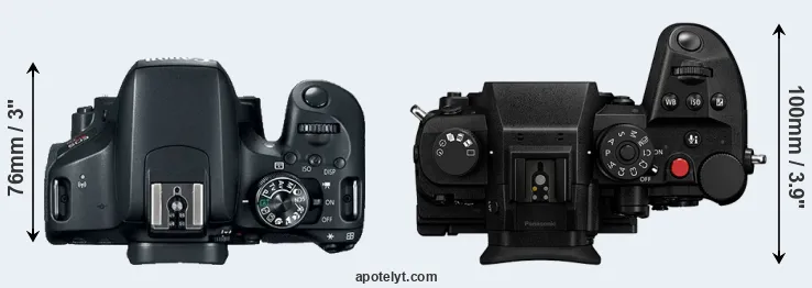 The physical size and weight of the Canon 800D and the Panasonic GH7 are illustrated in the side-by-side display below. The two cameras are presented according to their relative size. Three consecutive views from the front, the top, and the rear side are shown. All size dimensions are rounded to the nearest millimeter.