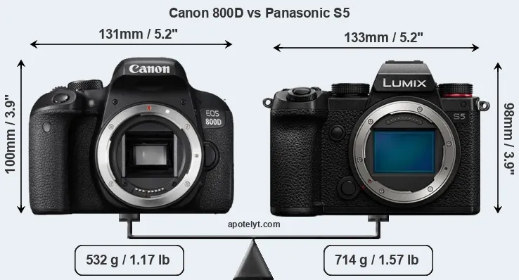 The side-by-side display below illustrates the physical size and weight of the Canon 800D and the Panasonic S5. The two cameras are presented according to their relative size. Three consecutive views from the front, the top, and the rear side are shown. All width, height and depth dimensions are rounded to the nearest millimeter.
