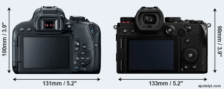 If the front view area (width x height) of the cameras is taken as an aggregate measure of their size, the Canon 800D and the Panasonic S5 are of equal size. However, the S5 is markedly heavier (34 percent) than the 800D. It is noteworthy in this context that the S5 is splash and dust-proof, while the 800D does not feature any corresponding weather-sealing.