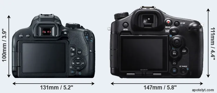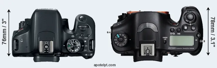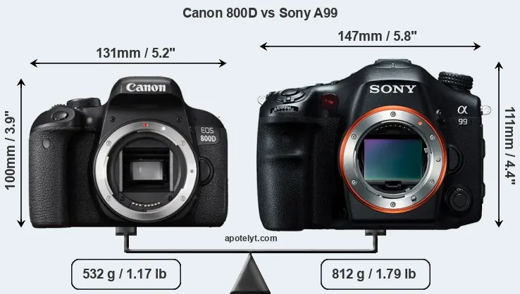 The physical size and weight of the Canon 800D and the Sony A99 are illustrated in the side-by-side display below. The two cameras are presented according to their relative size. Three consecutive views from the front, the top, and the rear side are shown. All width, height and depth measures are rounded to the nearest millimeter.
