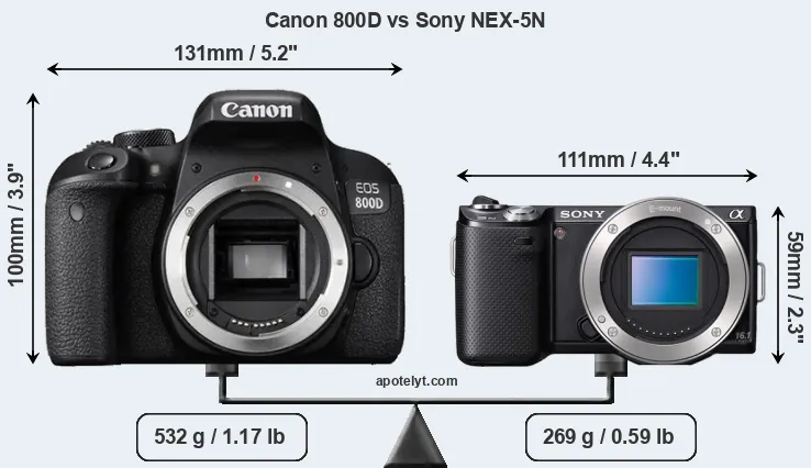 The above size and weight comparisons are to some extent incomplete since they do not consider the interchangeable lenses that both of these cameras require. Both cameras have similarly sized sensors, but DSLRs have a larger flange-to-focal plane distance than mirrorless cameras, which imposes contraints on the optical engineering process and generally leads to bigger and heavier lenses. You can compare the optics available for the two cameras in the Canon EF Lens Catalog (800D) and the Sony E-Mount Lens Catalog (NEX-5N). Mirrorless cameras, such as the NEX-5N, have moreover the advantage that they can use many lenses from other systems via adapters, as they have a relatively short flange to focal plane distance.