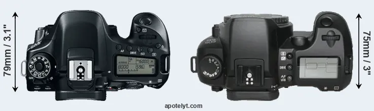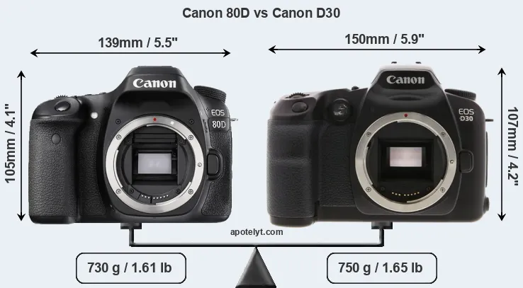 The physical size and weight of the Canon 80D and the Canon D30 are illustrated in the side-by-side display below. The two cameras are presented according to their relative size. Three consecutive perspectives from the front, the top, and the back are available. All width, height and depth measures are rounded to the nearest millimeter.
