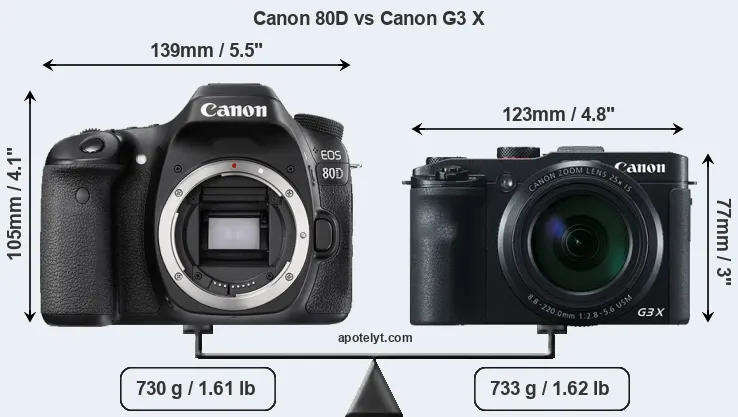 If the front view area (width x height) of the cameras is taken as an aggregate measure of their size, the Canon G3 X is considerably smaller (35 percent) than the Canon 80D. In this context, it is worth noting that both cameras are splash and dust-proof and can, hence, be used in inclement weather conditions or harsh environments.
