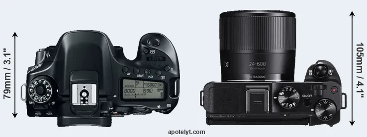 The side-by-side display below illustrates the physical size and weight of the Canon 80D and the Canon G3 X. The two cameras are presented according to their relative size. Three consecutive views from the front, the top, and the rear side are shown. All size dimensions are rounded to the nearest millimeter.