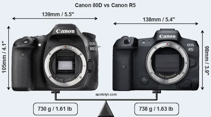The physical size and weight of the Canon 80D and the Canon R5 are illustrated in the side-by-side display below. The two cameras are presented according to their relative size. Three consecutive perspectives from the front, the top, and the back are available. All width, height and depth dimensions are rounded to the nearest millimeter.