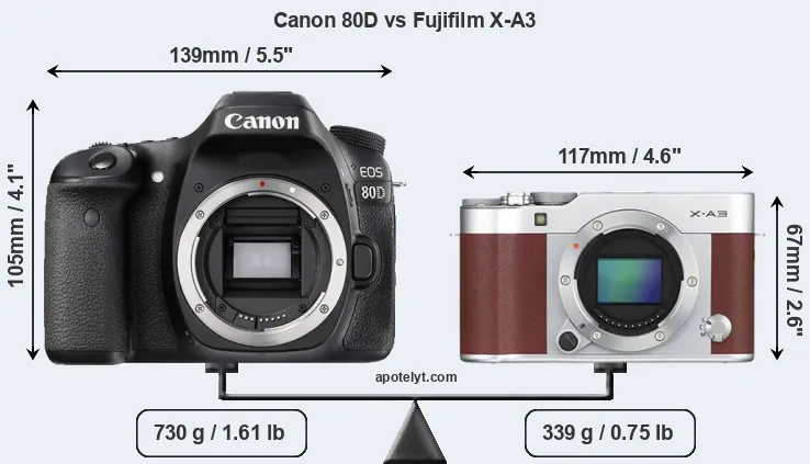 The above size and weight comparisons are to some extent incomplete since they do not consider the interchangeable lenses that both of these cameras require. Both cameras have similarly sized sensors, but DSLRs have a larger flange-to-focal plane distance than mirrorless cameras, which imposes contraints on the optical engineering process and generally leads to bigger and heavier lenses. You can compare the optics available for the two cameras in the Canon EF Lens Catalog (80D) and the Fujinon X Lens Catalog (X-A3). Mirrorless cameras, such as the X-A3, have moreover the advantage that they can use many lenses from other systems via adapters, as they have a relatively short flange to focal plane distance.