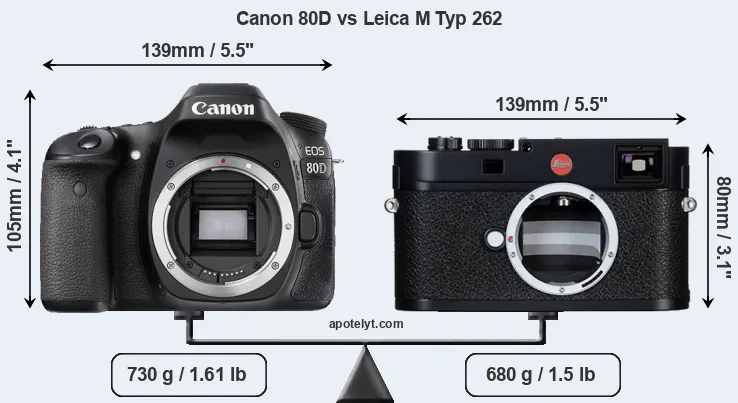 The physical size and weight of the Canon 80D and the Leica M Typ 262 are illustrated in the side-by-side display below. The two cameras are presented according to their relative size. Three successive views from the front, the top, and the rear are shown. All size dimensions are rounded to the nearest millimeter.