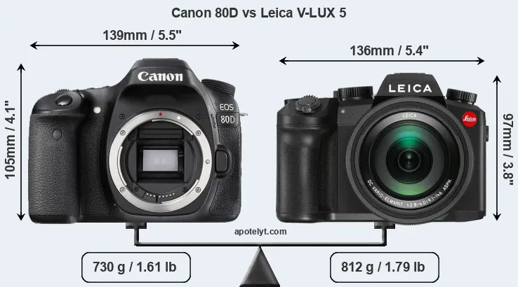 An illustration of the physical size and weight of the Canon 80D and the Leica V-LUX 5 is provided in the side-by-side display below. The two cameras are presented according to their relative size. Three consecutive views from the front, the top, and the rear side are shown. All width, height and depth measures are rounded to the nearest millimeter.