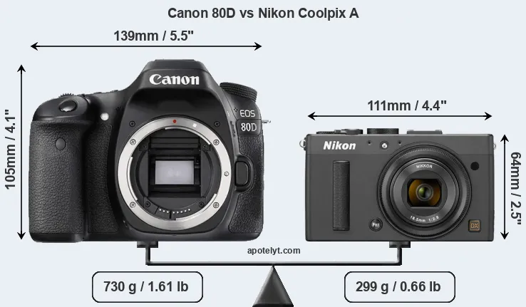 If the front view area (width x height) of the cameras is taken as an aggregate measure of their size, the Nikon Coolpix A is considerably smaller (51 percent) than the Canon 80D. It is worth mentioning in this context that the 80D is splash and dust resistant, while the Coolpix A does not feature any corresponding weather-sealing.