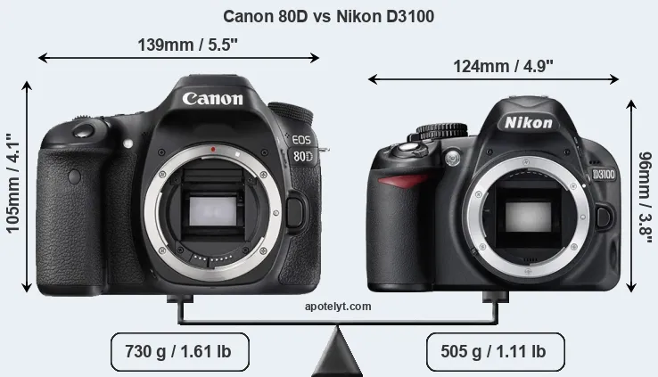 If the front view area (width x height) of the cameras is taken as an aggregate measure of their size, the Nikon D3100 is notably smaller (18 percent) than the Canon 80D. Moreover, the D3100 is markedly lighter (31 percent) than the 80D. It is worth mentioning in this context that the 80D is splash and dust resistant, while the D3100 does not feature any corresponding weather-sealing.