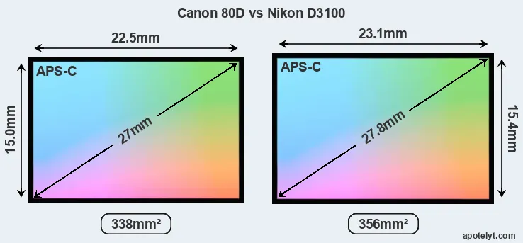 Both cameras under consideration feature an APS-C sensor, but their sensors differ slightly in size. The sensor area in the D3100 is 5 percent bigger. As a result of these sensor size differences, the cameras have format factors, respectively, of 1.6 (80D) and 1.5. Both cameras have a native aspect ratio (sensor width to sensor height) of 3:2.