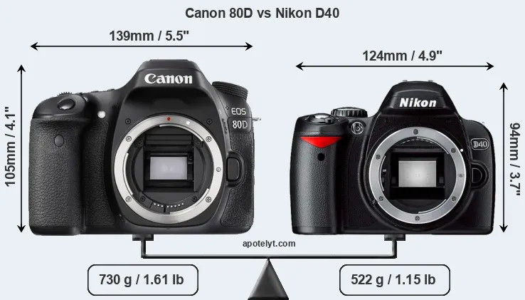 An illustration of the physical size and weight of the Canon 80D and the Nikon D40 is provided in the side-by-side display below. The two cameras are presented according to their relative size. Three consecutive perspectives from the front, the top, and the back are available. All width, height and depth measures are rounded to the nearest millimeter.