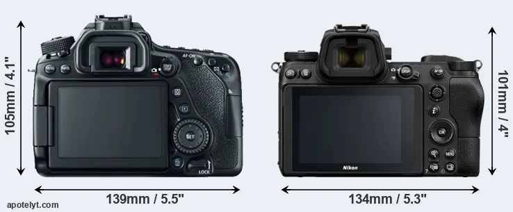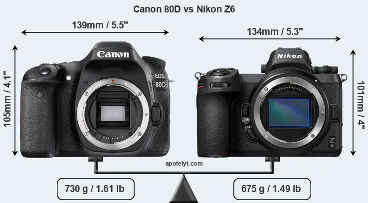 The physical size and weight of the Canon 80D and the Nikon Z6 are illustrated in the side-by-side display below. The two cameras are presented according to their relative size. Three successive views from the front, the top, and the rear are shown. All width, height and depth measures are rounded to the nearest millimeter.